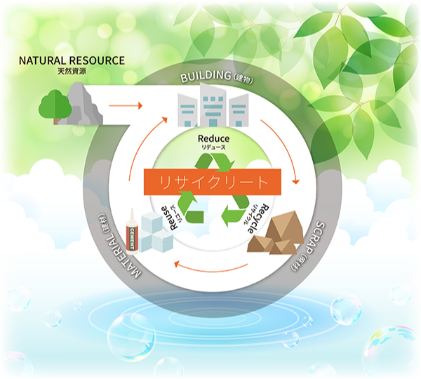 リサイクリートとは近年の循環化社会への気運を受けて、消費するのみだったコンクリートを3R(リユース・リデュース・リサイクル)の観点から再循環させようという弊社が行っている研究の登録商標です。(商標登録 第5416045号)